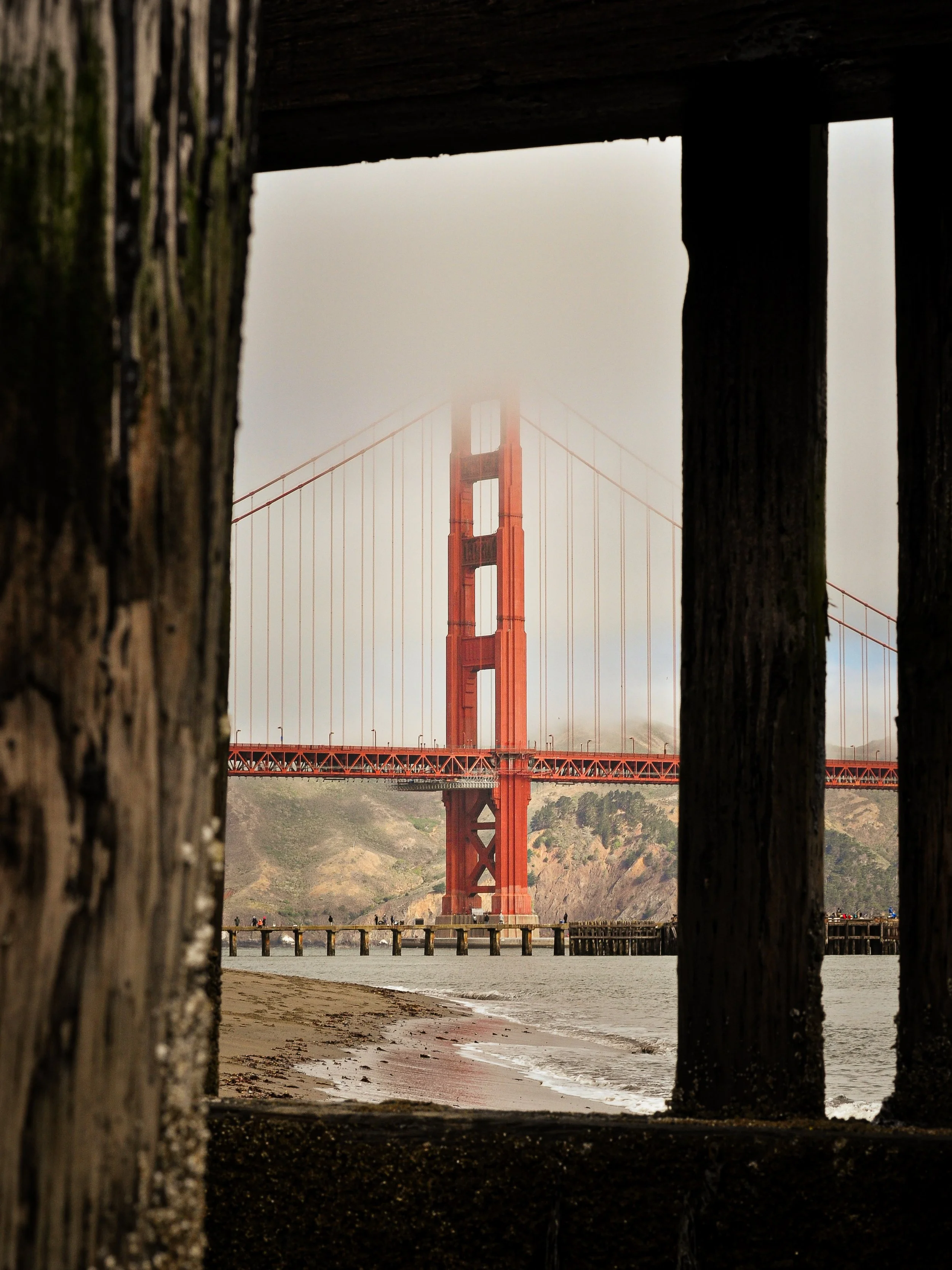 The Golden Gate Bridge viewed through a wooden pier or structure, with fog partially obscuring the top of the bridge.