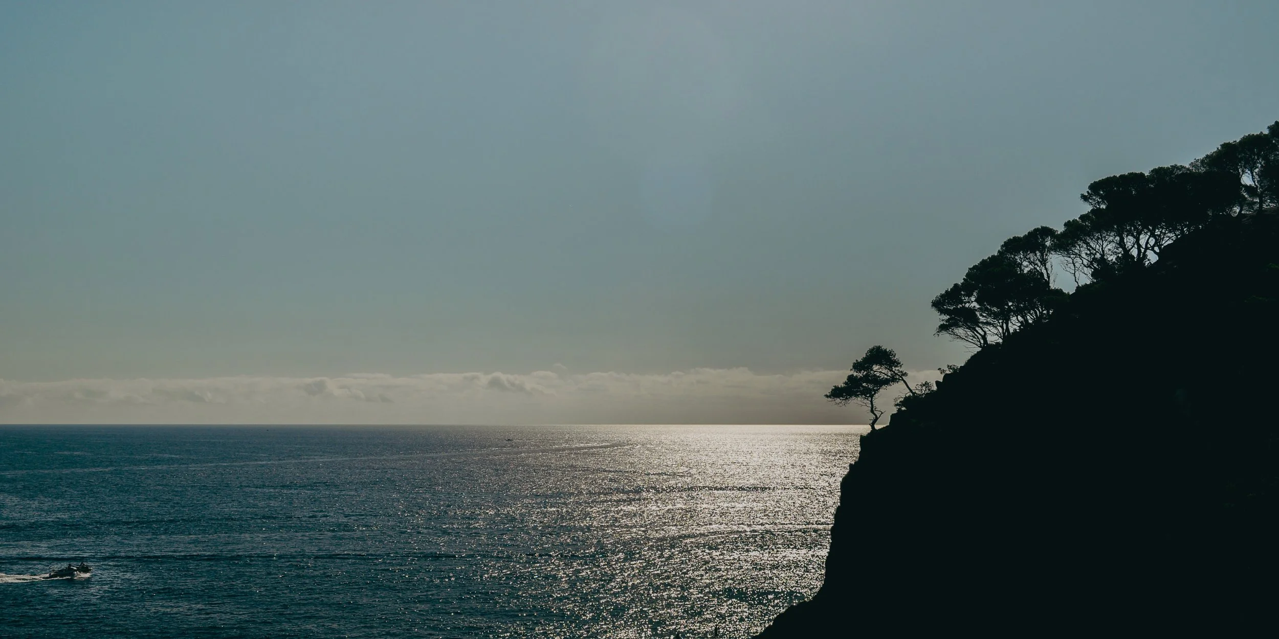 Silhouette of a hillside with trees overlooking a shimmering ocean with a boat and calm waves, under a clear sky.