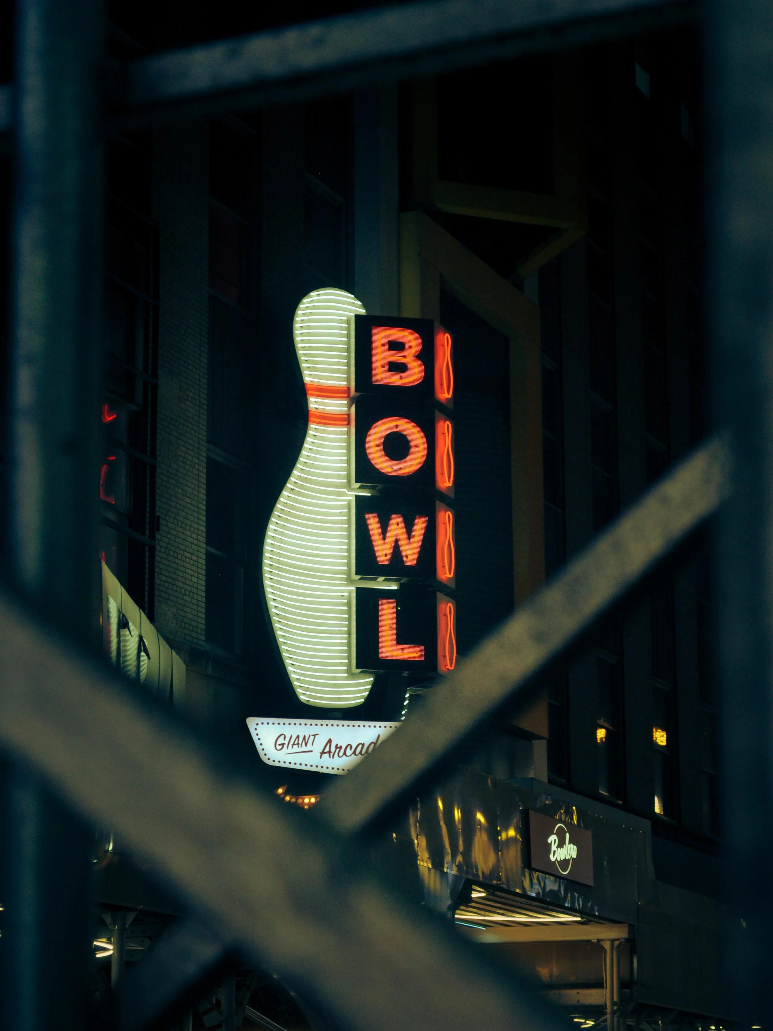 Neon sign for a burger joint reading 'BOWL' with a graphic of a burger bun in the background at night.