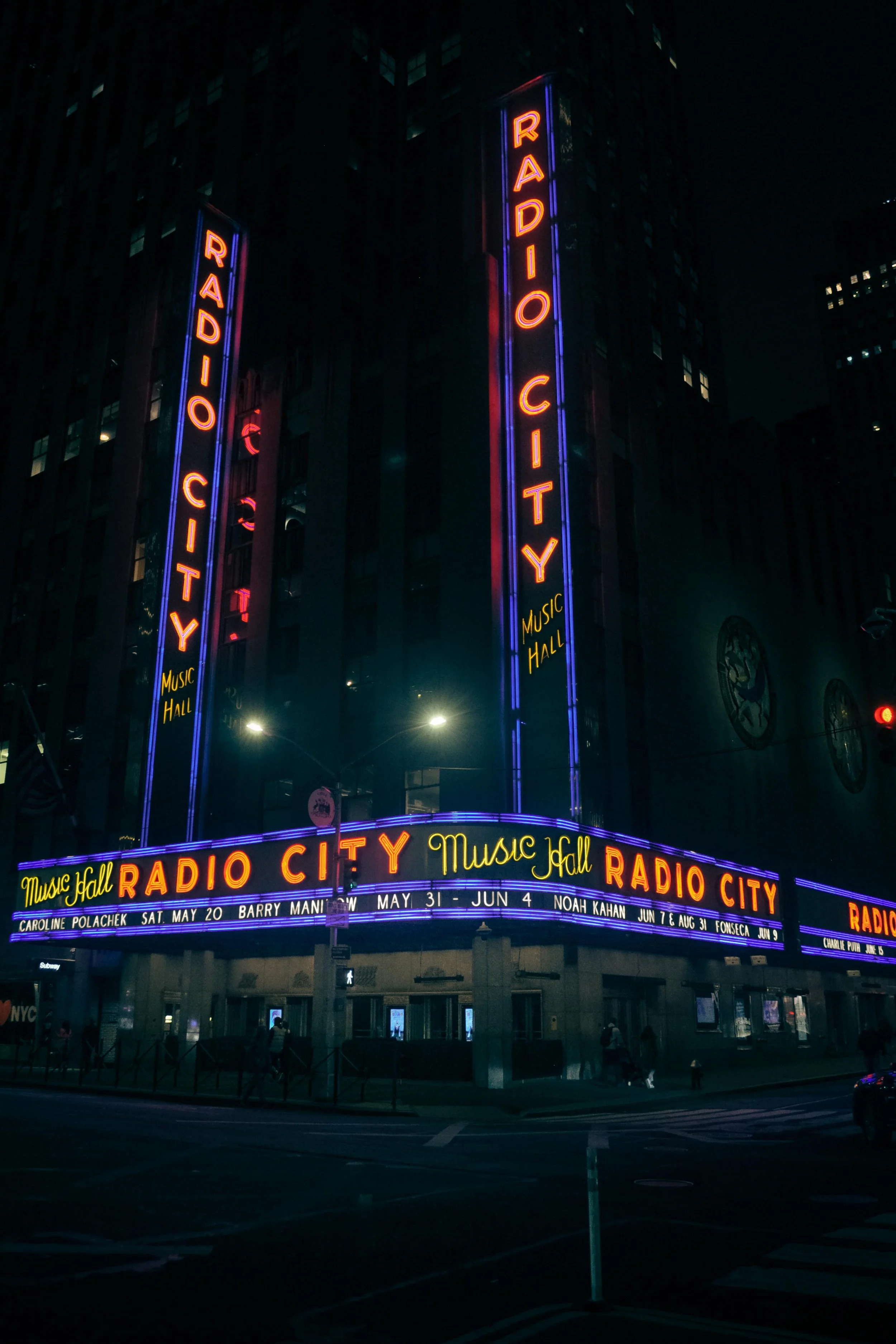 Night view of Radio City Music Hall in New York City with bright neon signs displaying its name.