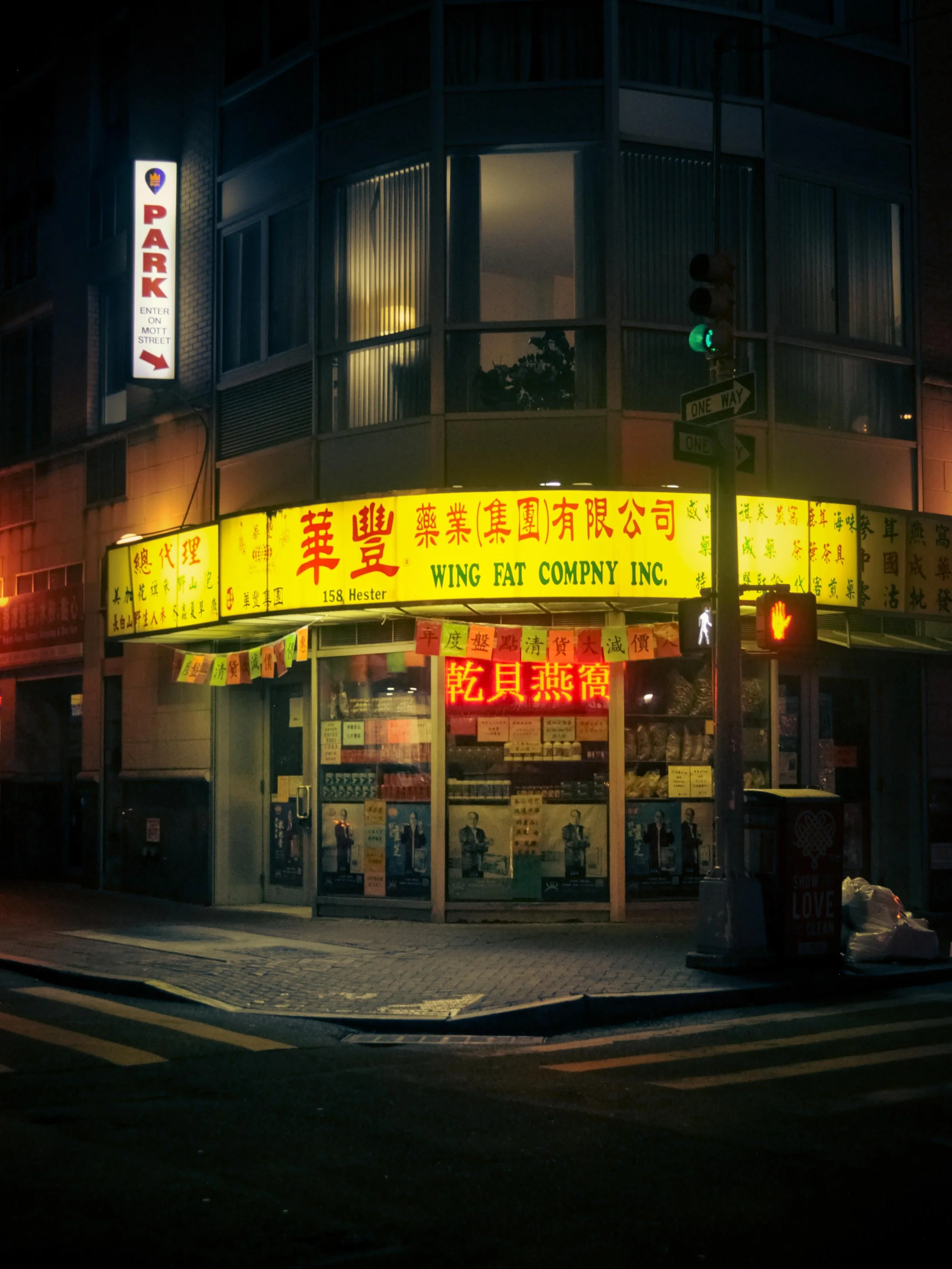 Night view of a corner storefront with illuminated yellow and red neon signs displaying Chinese characters and English text, including "Wing Fat Company Inc." and a street address, with traffic signs and a traffic light nearby.